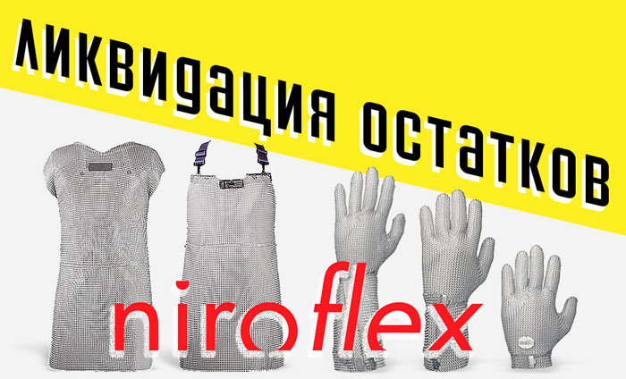Дорогие друзья! Мы рады сообщить вам о начале акции на ликвидацию остатков продукции Niroflex. Это уникальная возможность приобрести высококачественные кольчужные перчатки и фартуки по сниженным ценам!
