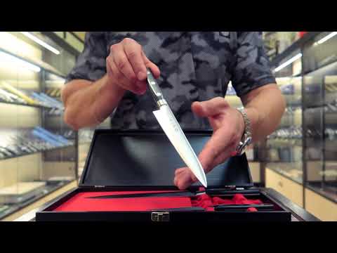 Клинки выполнены из знаменитой свой прочностью и режущими свойствами стали VG-10 от компании Takefu, закаленной до твердости 61 HRC легко правятся и хорошо держат заточку.