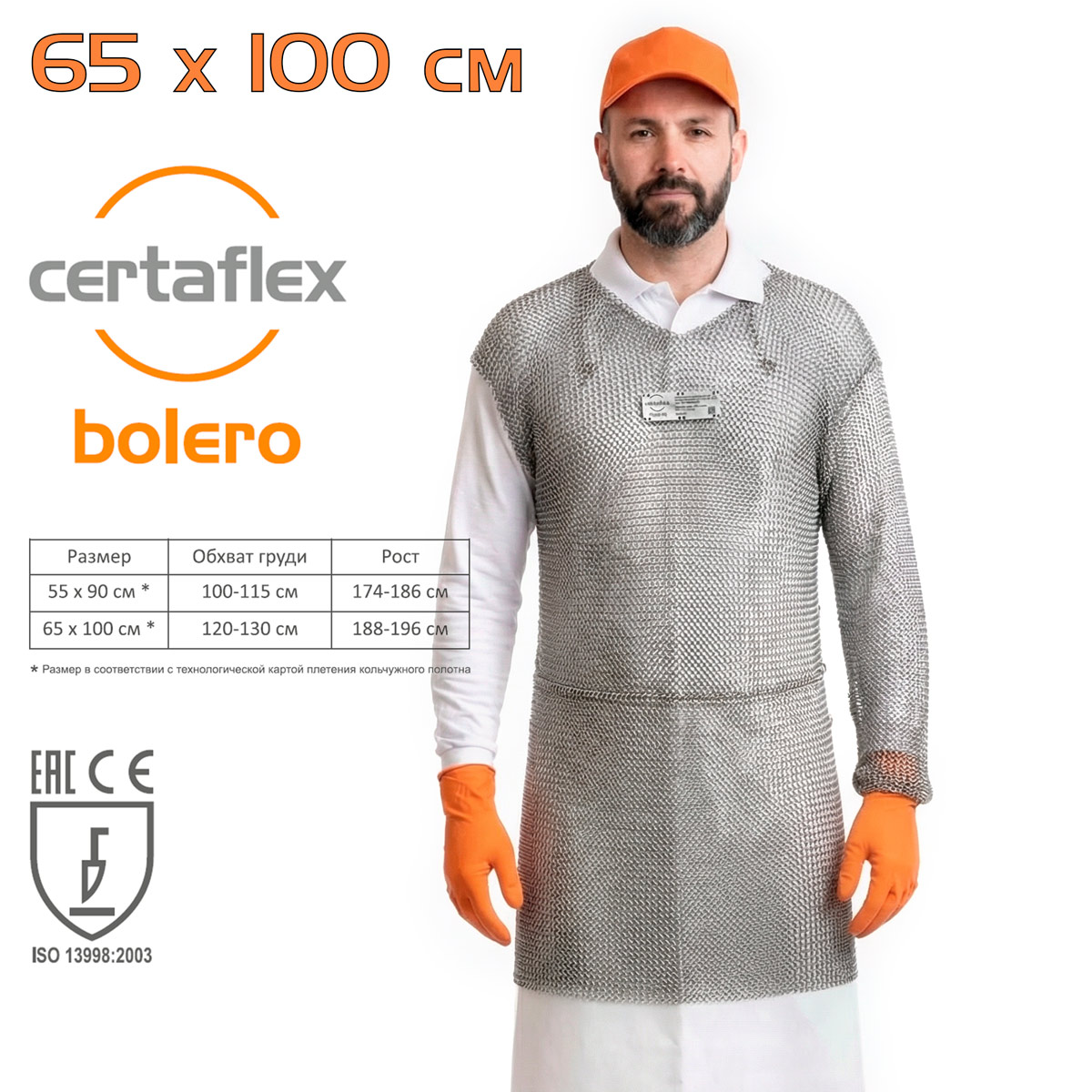 Кольчужное защитное болеро Certaflex Bolero 7.0 размера 65×100 см с одним левым рукавом разработано специально для работников мясоперерабатывающих производств, выполняющих ручную разделку и обвалку мяса. Изделие обеспечивает надёжную защиту грудной клетки и левой руки от порезов и колотых ран, наносимых ручными ножами при интенсивной работе в современных цехах.